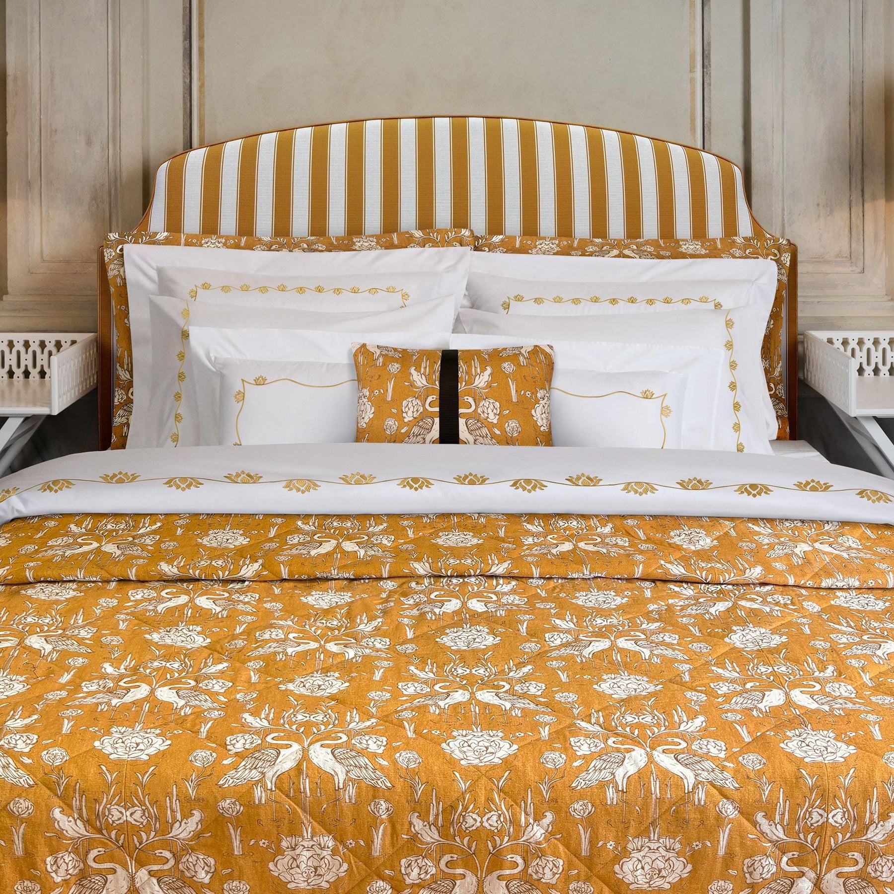 This decorative cushion is designed with white illustrations on a warm mustard-toned background. A band detail runs across the surface, adding a graphic accent while lending a contemporary character to the design. The pattern features lotus motifs symbolizing purity and renewal, together with crane figures representing grace and loyalty. 100% linen. Made in Türkiye.