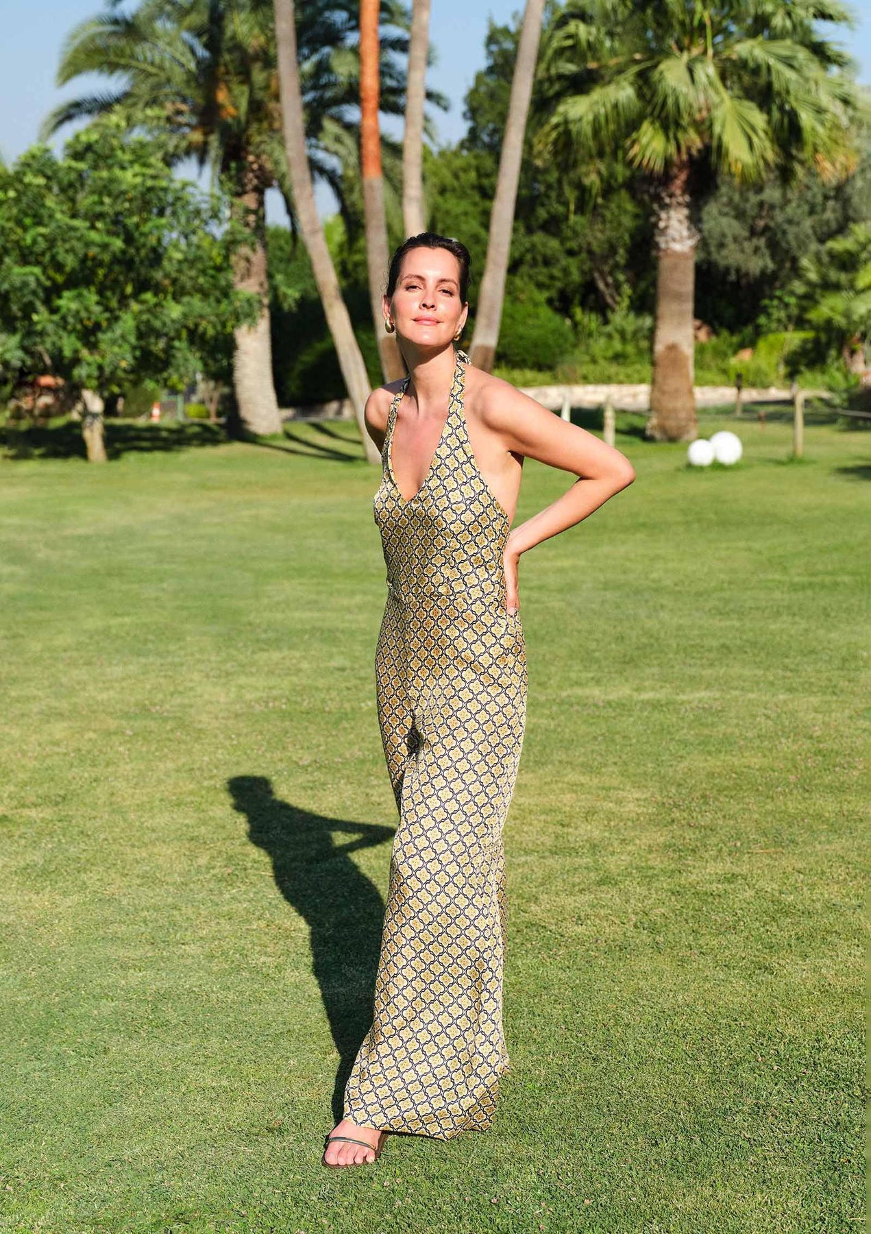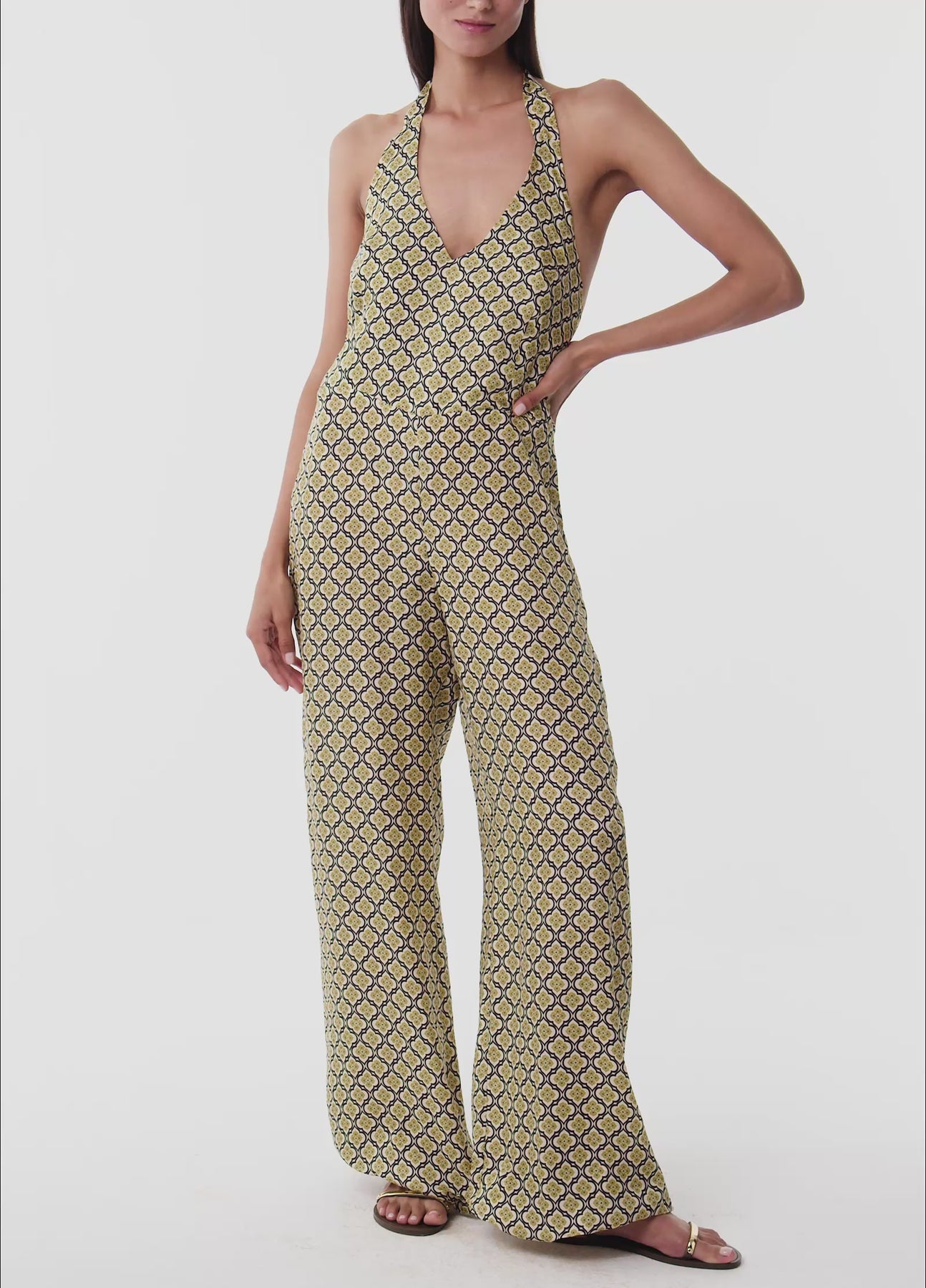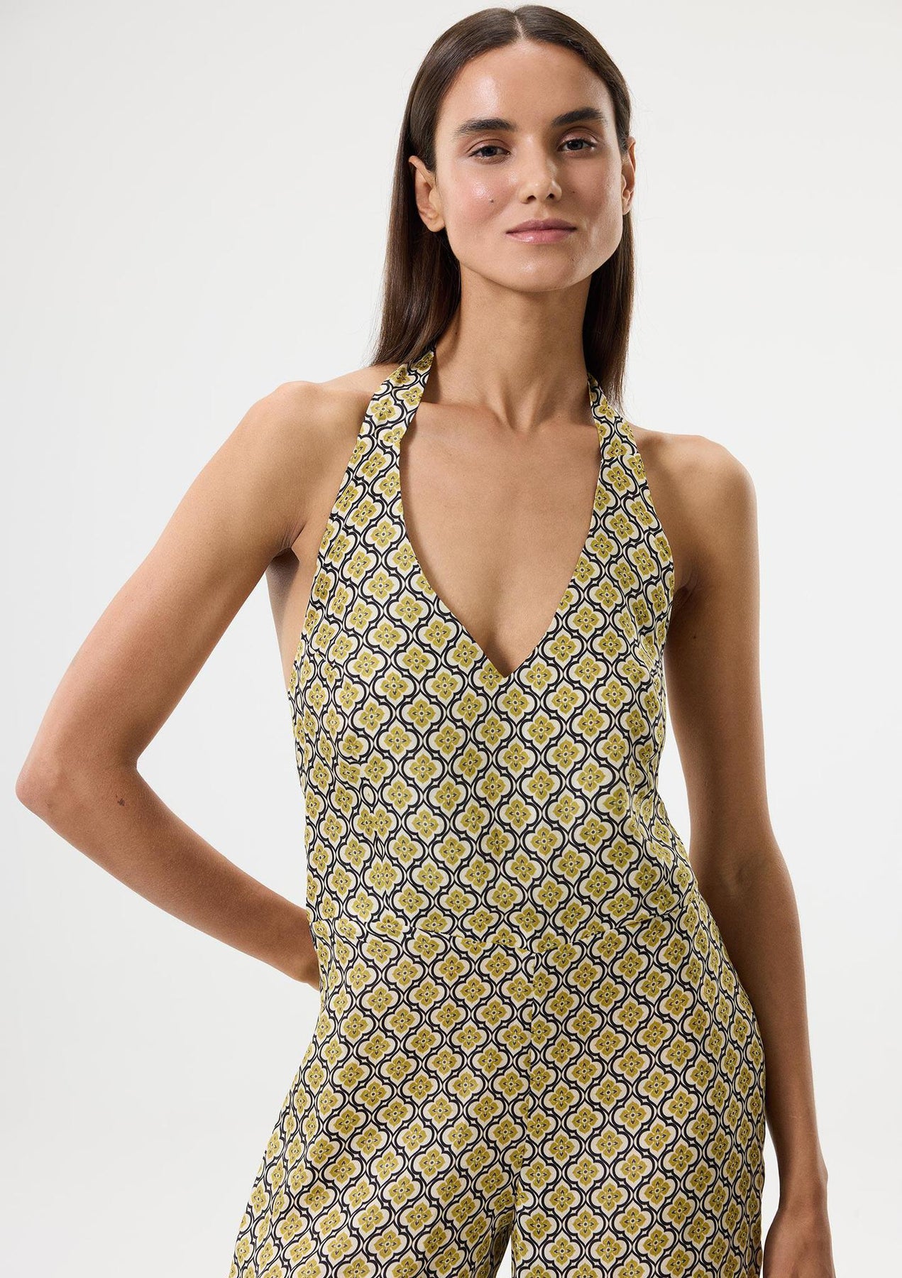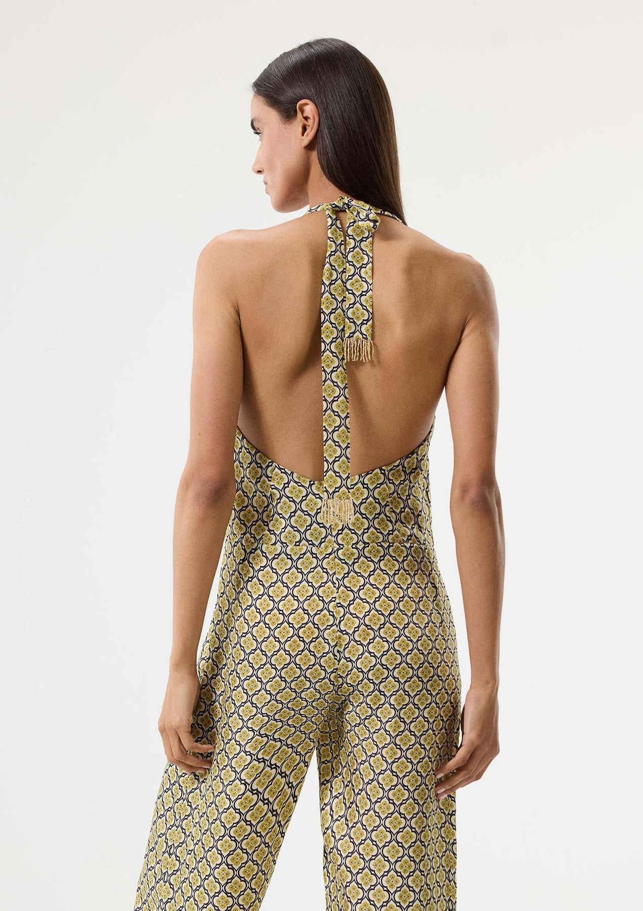 This jumpsuit features a halter neckline with tie closure and delicate tassel details at the ends. Crafted from soft, lightweight lyocell, it offers a fluid drape and a modern, elongated silhouette. The geometric pattern brings visual depth, while the adjustable neckline ensures a more refined fit. 100% lyocell. Made in Turkey.
