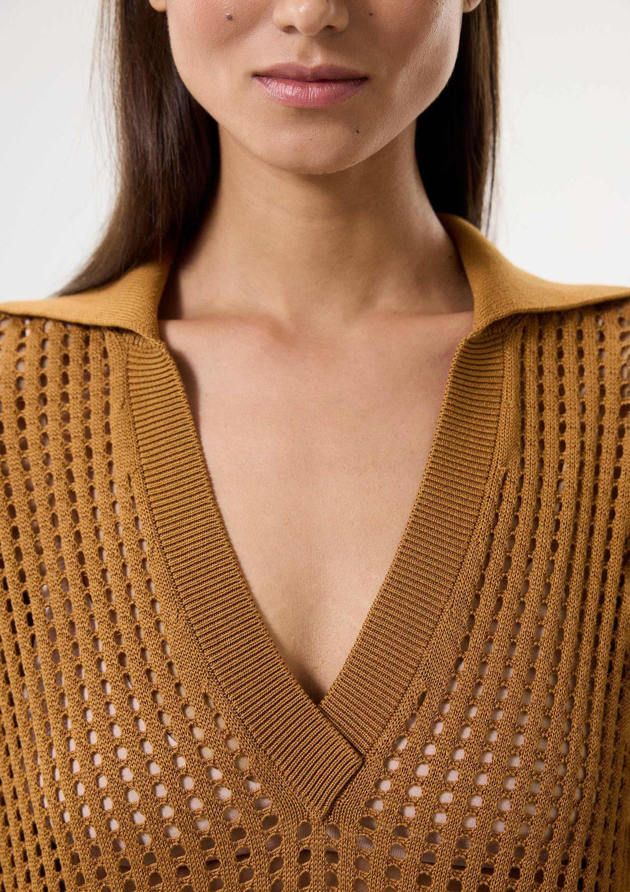 This long dress is crafted from cotton crochet fabric, offering a relaxed fit. The deep V-neckline and wide sleeves create a casual silhouette, while the ribbed collar and cuffs provide subtle structure. Finished with an A-line shape for ease of movement. 100% cotton. Made in Turkey.