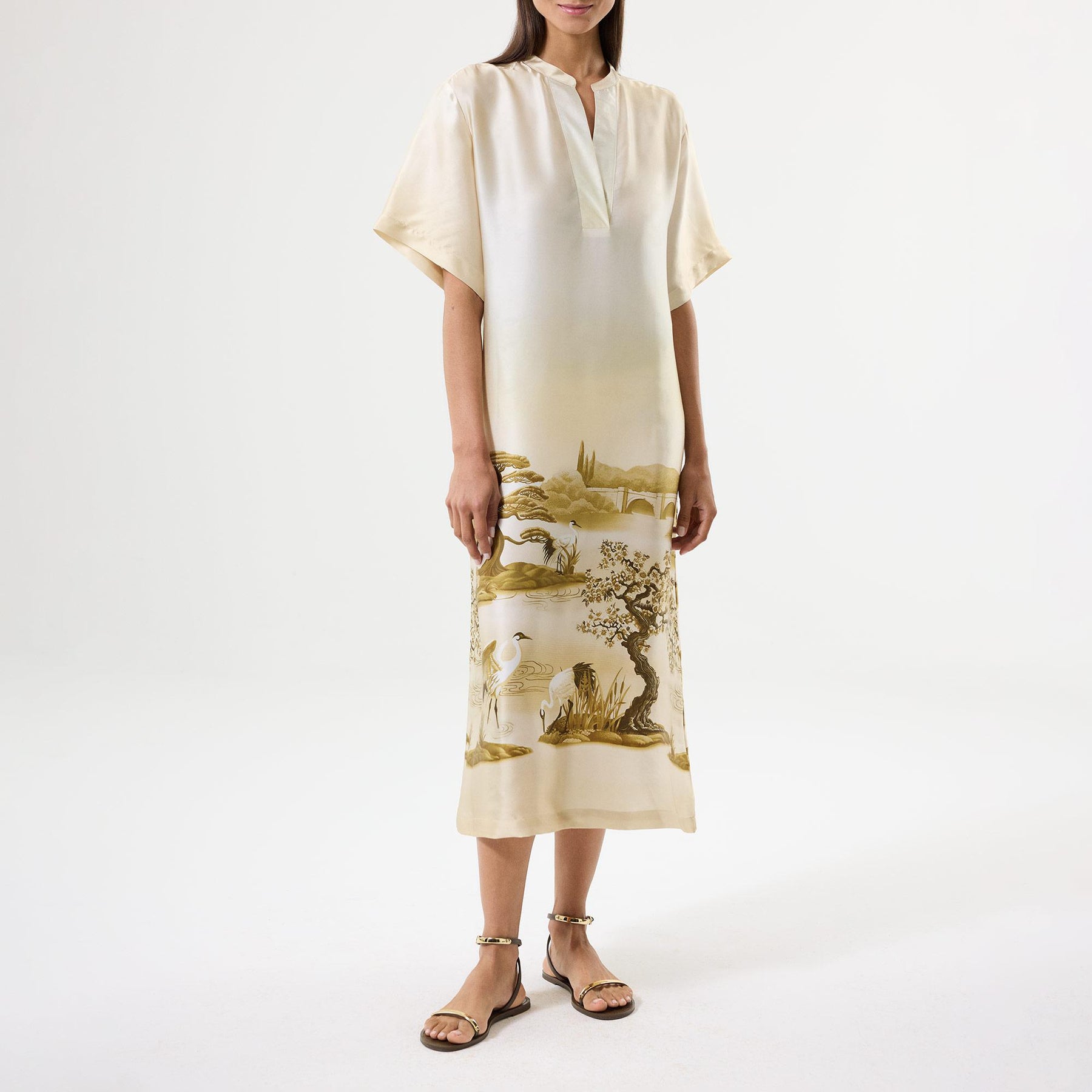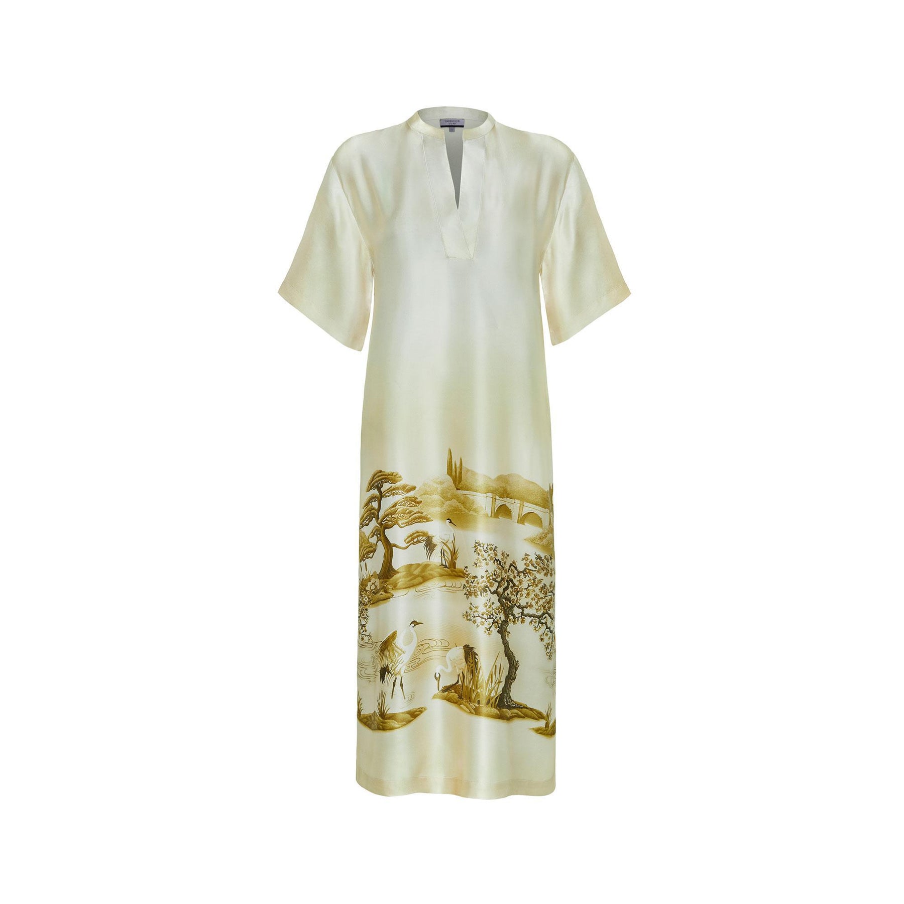 Crafted from 100% silk, this kaftan features an illustrative scene that extends across the lower body and wraps around to the back. The soft sheen of the fabric brings the detailed elements to life, while the relaxed silhouette, side slits and refined neckline offer effortless elegance. 100% silk. Made in Turkey.
