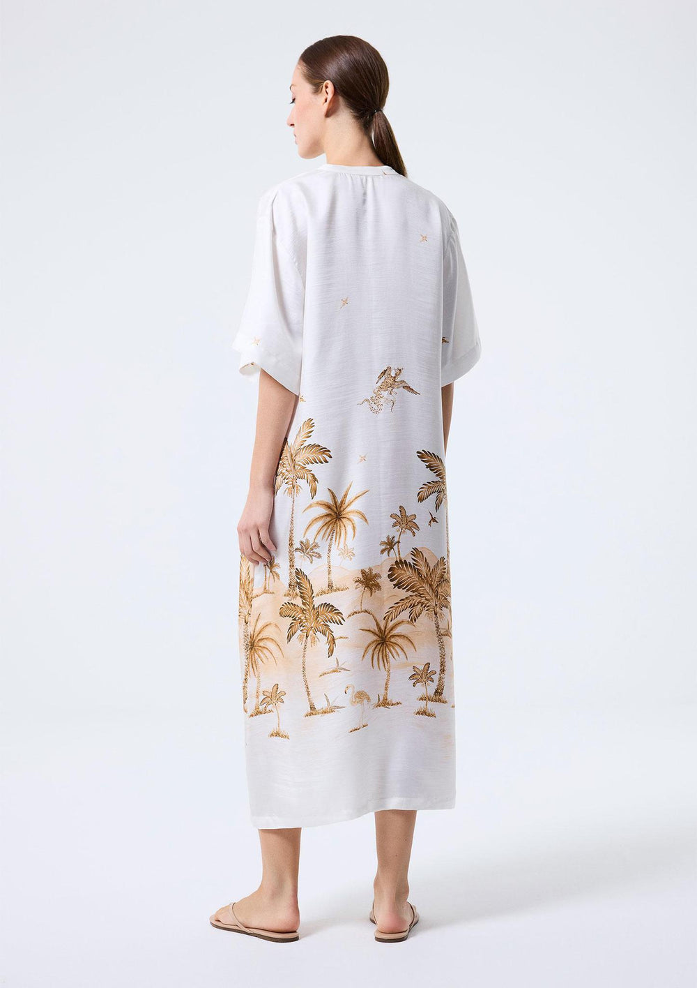 This relaxed-fit dress features an elegant palm tree motif that brings a touch of tropical charm. Made from a lightweight fabric, it drapes gracefully for a comfortable and flowing silho uette. The simple V-neckline and short sleeves enhance its casual yet refined style.100% silk . Made in Turkey.