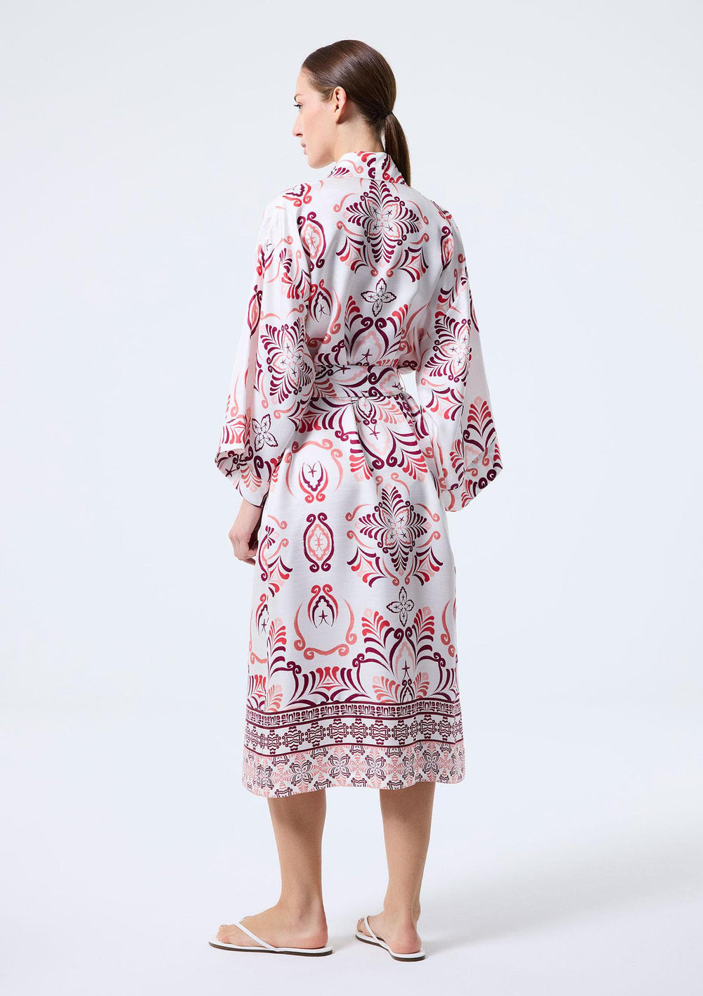 This exquisite kimono is adorned with intricate patterns inspired by traditional motifs. Made from lightweight fabric, it showcases flowing sleeves and a self-tie belt to accentuate the waist, providing a relaxed yet flattering silhouette. Additionally, it includes discreet pockets on the sides for added convenience. 100% silk . Made in Turkey.