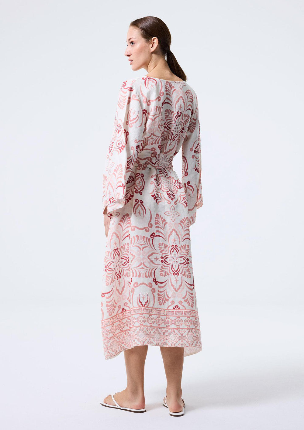 This dress combines artistic flair with relaxed elegance, featuring a vibrant, intricate motif inspired by traditional patterns. The lightweight fabric drapes naturally, offering a comfortable fit with a flowing silhouette. A self-tie belt, detailed with delicate beads at the ends, provides the option to cinch the waist, adding definition to the look. Wide sleeves and a soft V-neckline, adorned with a button closure, enhance the effortless appeal.100% linen. Made in Turkey.
