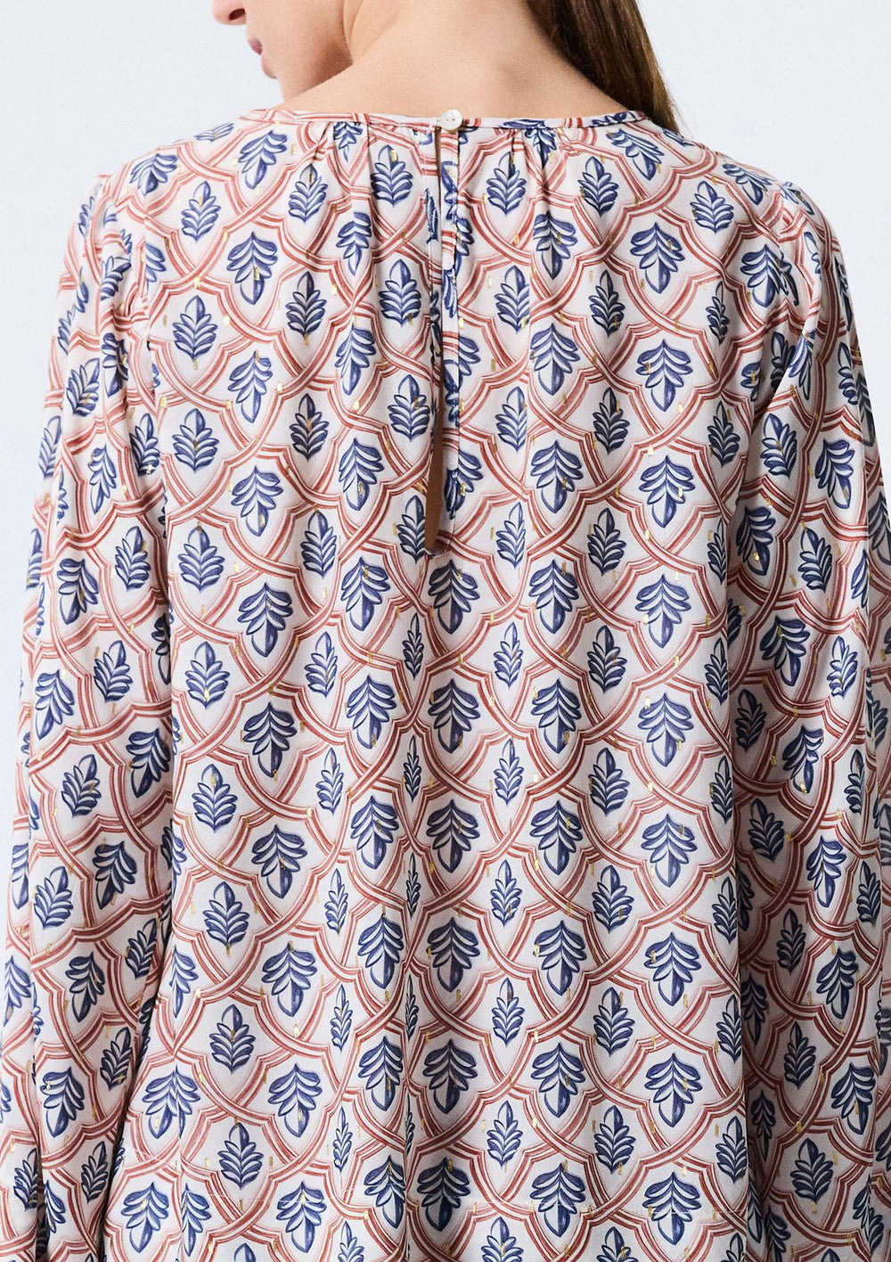 This comfortable and elegant blouse stands out with its modern cut and unique motifs, adorned with delicate gold details that add a touch of sophistication. Its loose fit and lightweight fabric provide comfort during the summer months. The blouse is finished with a mother-of-pearl button at the back of the neckline. You can also purchase it with matching pants in the same pattern. 100% viscose. Made in Turkey.
