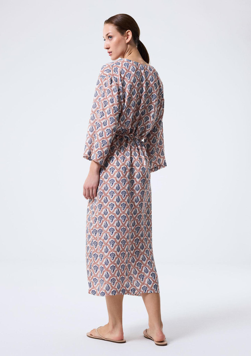 This long dress, featuring red and blue toned motifs, offers an elegant look with its flowy and comfortable design. The pattern is enriched with fine gold details, adding a touch of sparkle to the dress. The V-neckline and belt detail highlight its chic style, while the soft fabric ensures all-day comfort. The sleeves are wide-cut, and the waist has an adjustable tie. 100% viscose. Made in Turkey.
