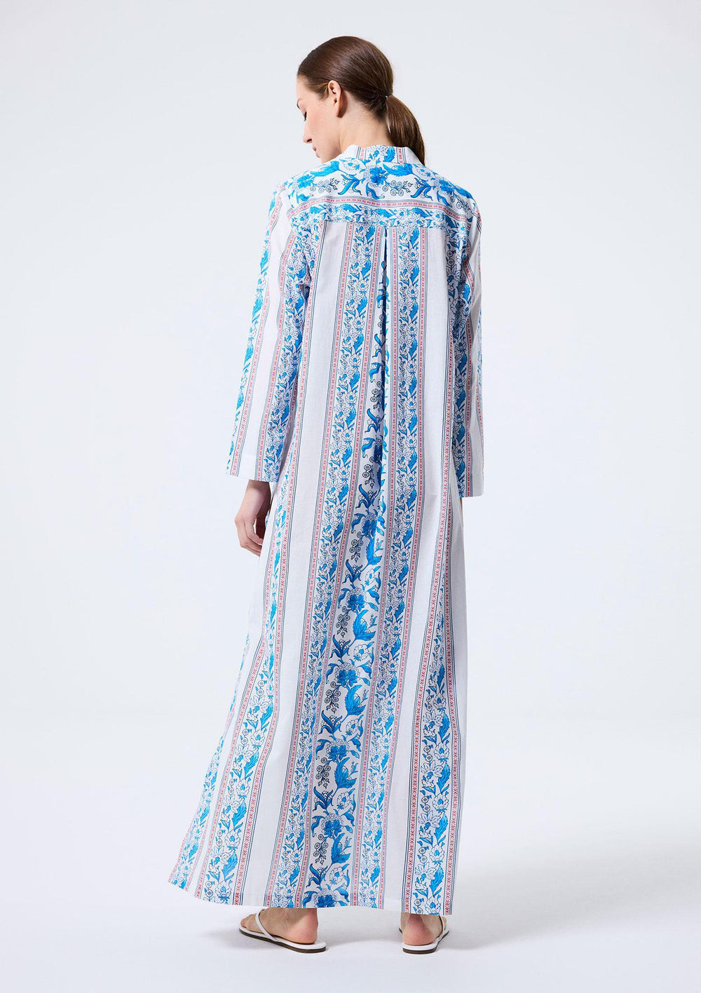With its long and flowing silhouette, this dress exudes elegance, highlighted by harmonious patterns formed with blue and accented by red motifs. Side slits add freedom of movement and a modern touch, while the unique strap details on the plunging neck complete its distinctive design. 100% cotton. Made in Turkey.