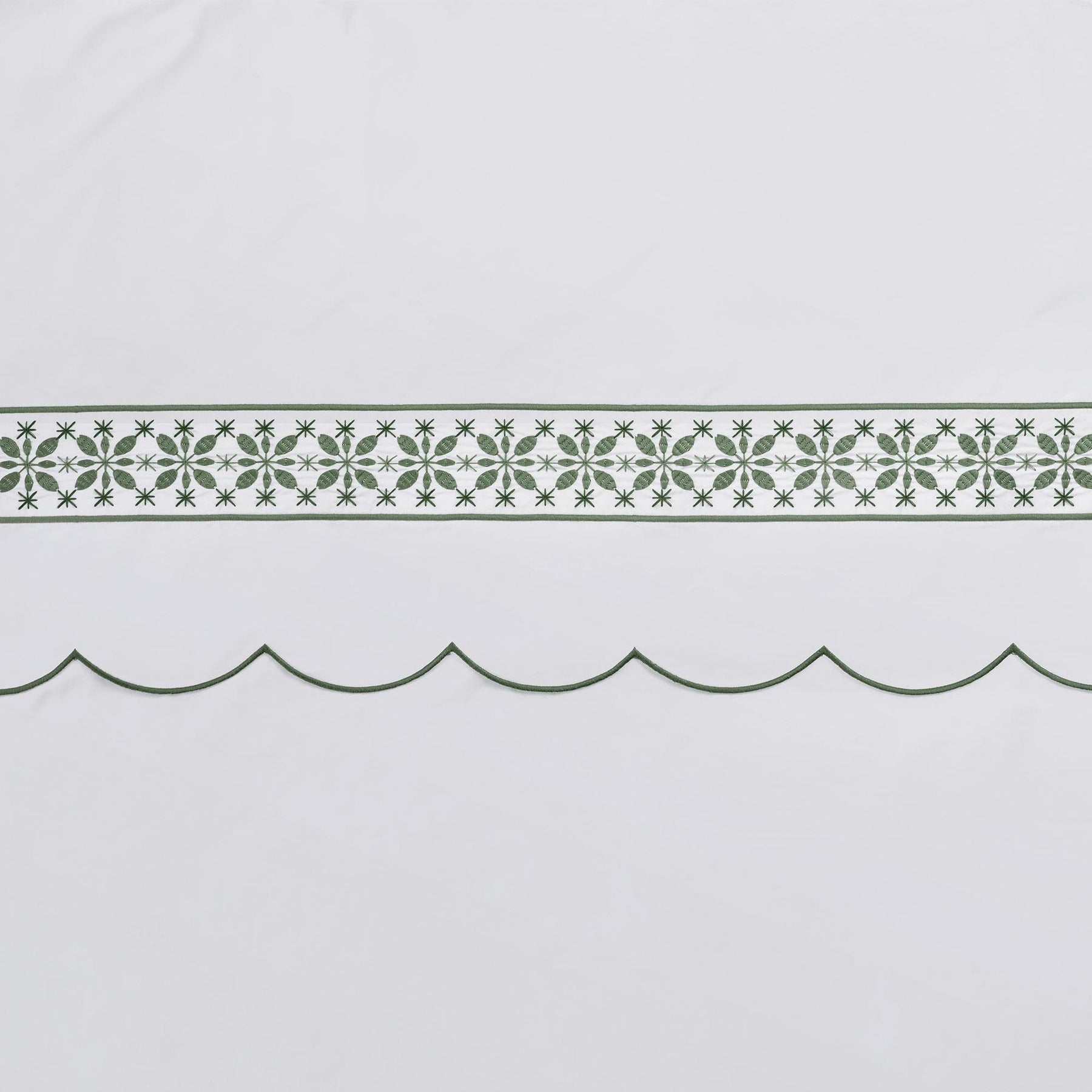 This elegant duvet cover features delicately embroidered floral motifs. Beneath the embroidery lies a scalloped edge, traced with fine stitching that gracefully follows its curves. This refined detail completes the lower hem, adding a soft and elegant touch to the design. Material: 100% finest combed cotton sateen. Made in Turkey.