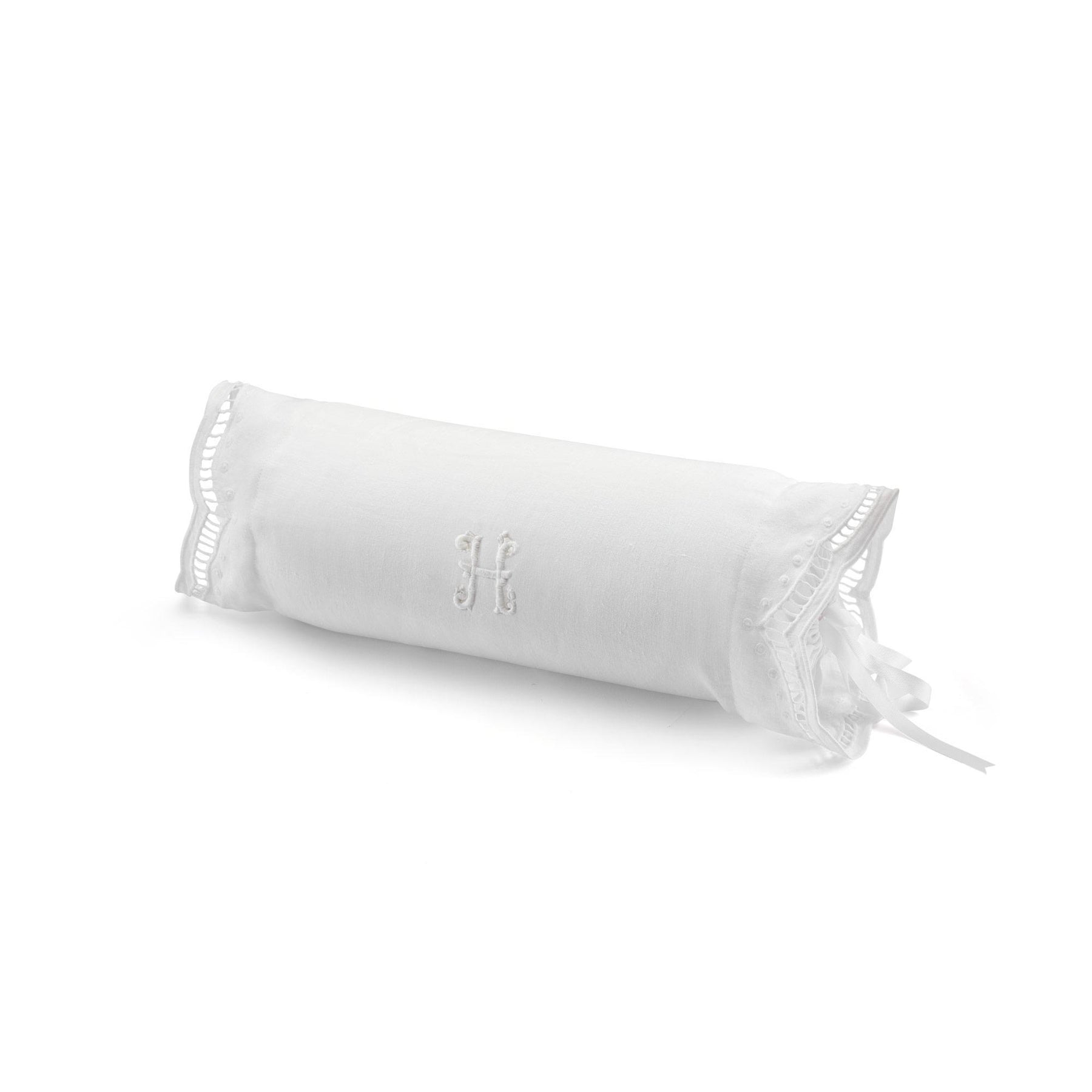 Crafted from crisp white linen, this custom made bolster cushion cover gains a refined character through its H monogram at the center. Scalloped openwork embroidery and softly gathered ribbon ties at the ends lend a gentle silhouette to the design, turning it into an elegant finishing touch for the bed. Products made with your selected initial will be shipped within 4 weeks following your order. Material: 100% linen. Made in Türkiye.