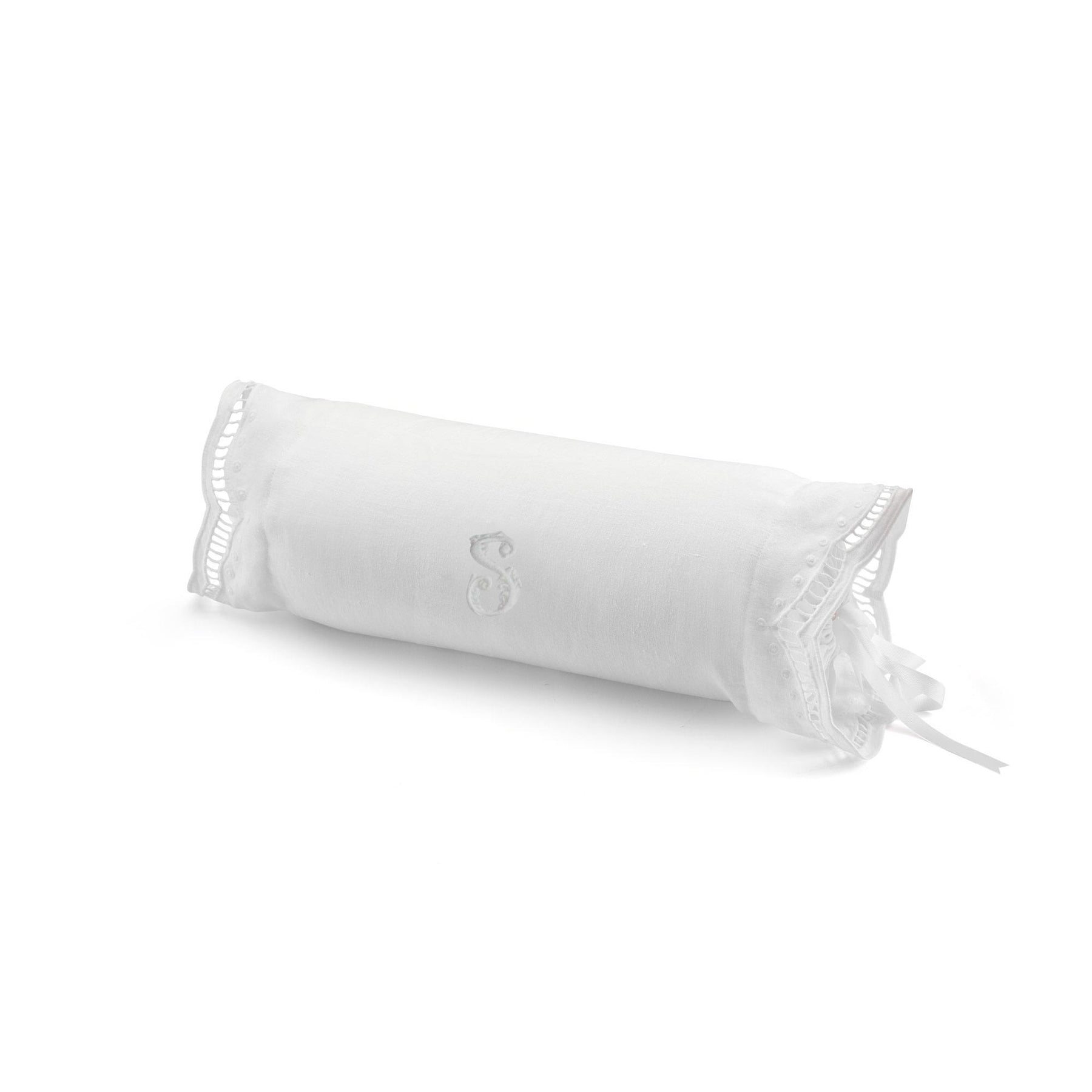Crafted from crisp white linen, this bolster cushion gains a refined character through its embossed monogram at the center, which can be personalized with your initial. Scalloped openwork embroidery and softly gathered ribbon ties at the ends lend a gentle silhouette to the cushion, turning it into an elegant finishing touch for the bed. Material: 100% linen. Made in Turkey.