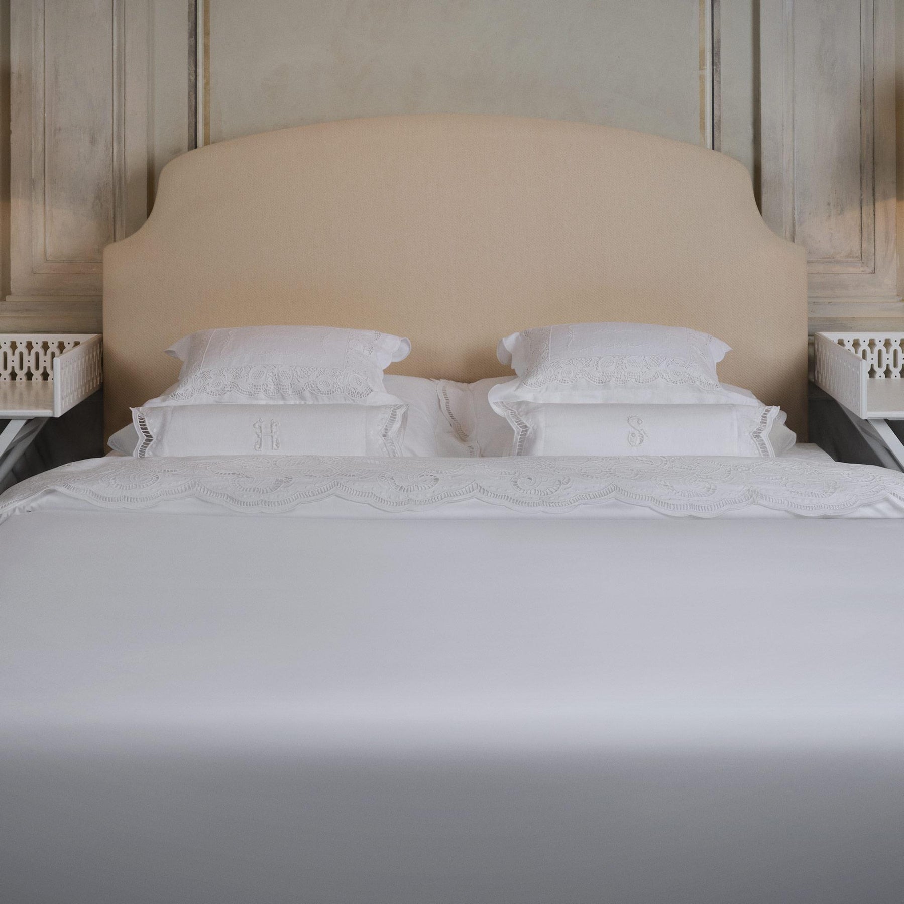 This flat sheet combines two distinct textures for an elegant layered look. The main body, which lies against the skin, is made of 100% cotton sateen, while the fold-over panel is crafted from linen. Adorned with openwork pomegranate motifs, the linen section adds a refined decorative accent and creates a graceful layer when folded over a duvet, coverlet, or bedspread. Material: bottom piece 100% finest combed cotton sateen; top piece 100% linen. Made in Turkey.