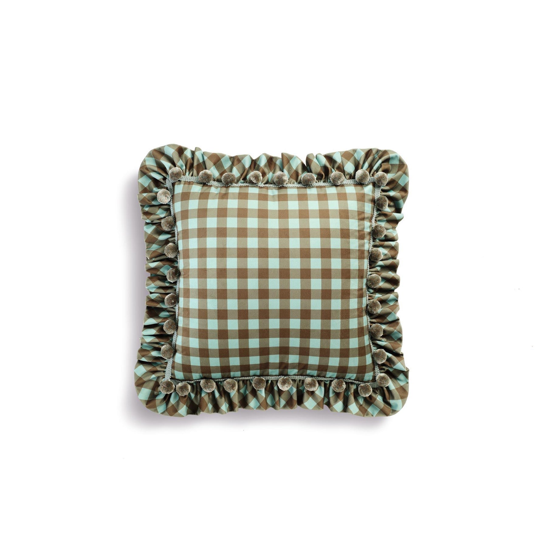 Crafted from green and white gingham-patterned velvet, this decorative pillow gains a romantic touch with ruffled edges framing all four sides. Small pom-poms nestled within the ruffles add a subtle sense of movement and textural richness to the design. Material: velvet. Made in Turkey.