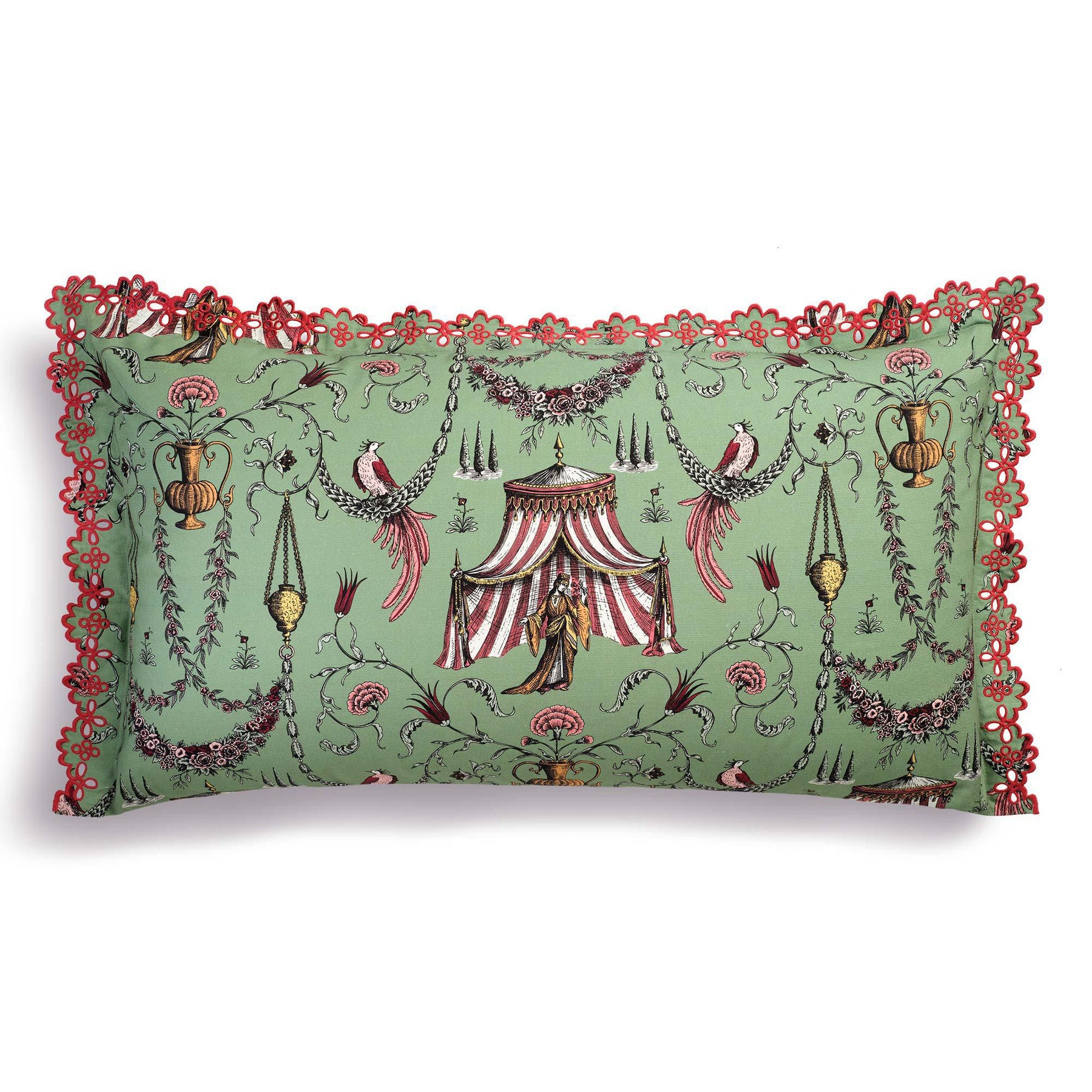 Crafted with the Seferî pattern, this decorative cushion cover reflects the story of the collection on a green background with its tent motif, birds, and natural elements. Designed in the Toile de Jouy technique, the motifs are brought together in a grotesque style. The openwork embroidery along three edges gives the cushion cover an elegant finishing touch. The inner cushion is sold separately. Material: 100% cotton. Made in Turkey.