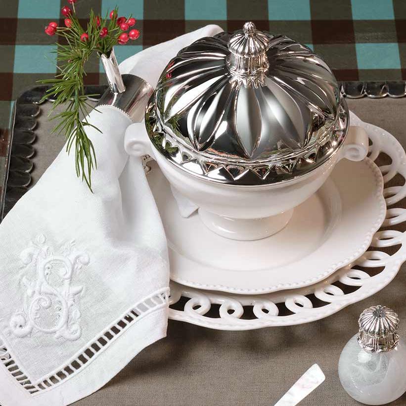 This silver-plated serving dome is crafted with a modern design approach, inspired by the elegant lines of traditional hammam bowls. Its embossed surface reflects light from different angles, adding a refined sense of grandeur to the table, while creating a harmonious unity with the bowls from the Storyteller tableware collection. Material: silver-plated brass. Made in Turkey.