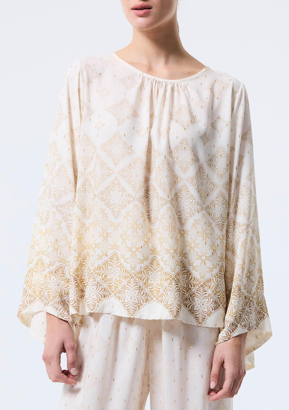 This top showcases a delicate soft-toned pattern accented with gold details, offering a subtle touch of elegance. The design includes gracefully flared sleeves, a gently wide, rounded neckline, and a mother-of-pearl button at the back of the neckline for a refined yet effortless look. Combine it with its matching pants. 100% viscose. Made in Turkey.