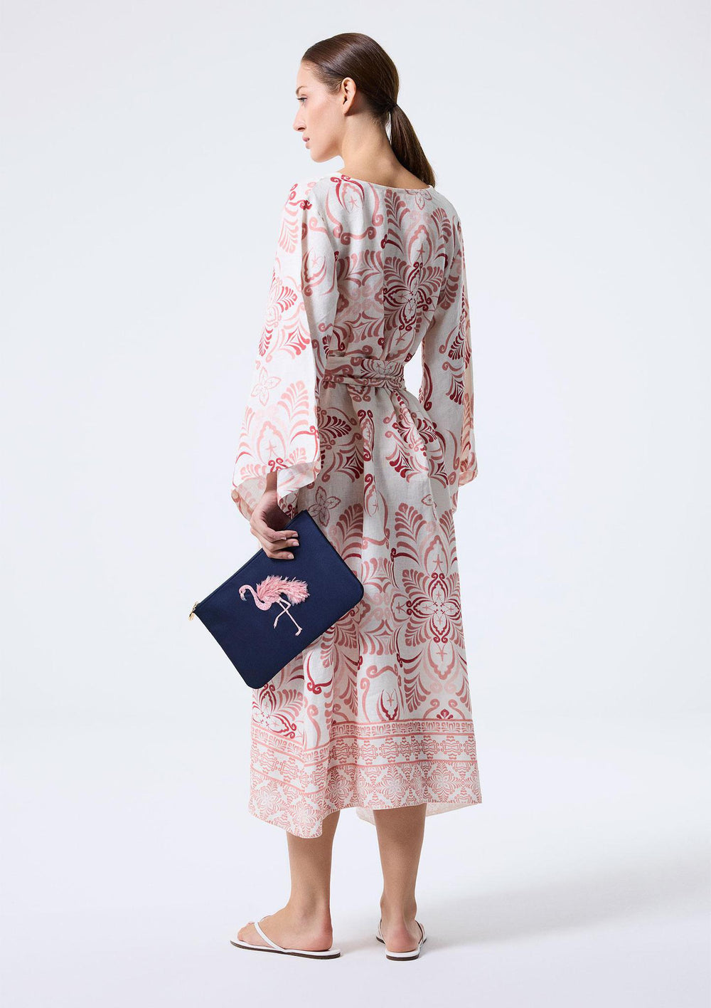 This clutch stands out with a hand-embroidered flamingo motif on the front, delicately embellished with feather accents, adding a unique and elegant touch. The interior features a soft lining with a small pocket. This clutch also has a gold-tone zipper pull with an embossed detail, further enhancing its refined look.