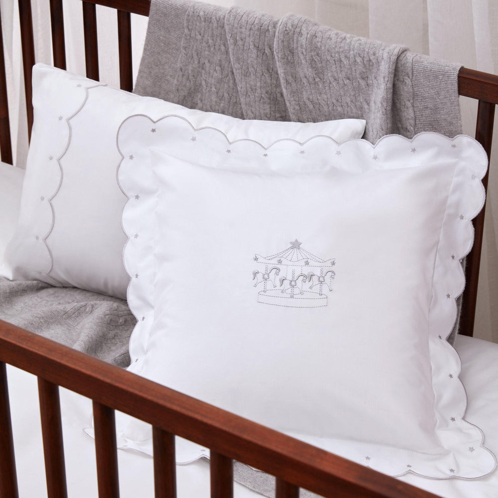 Create a whimsical wonderland in your baby's nursery with our new pillowcase - a tender embrace for your little dreamer. This enchanting bedding features a beautifully embroidered carousel, a lovely symbol of childhood joy and playfulness. The carousel comes to life with three meticulously crafted horses, each adorned with saddles and bridles, dancing in harmony beneath a charming roof. 100% Egyptian Cotton. Made in Turkey.
